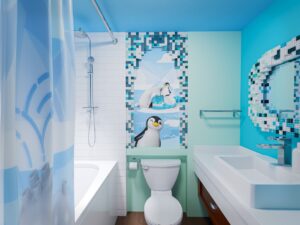 El área infantil se transforma en las exuberantes selvas de Sudamérica, donde las llamas encuentran sombra y los perezosos dormidos cuelgan de las ramas. Mientras tanto, el baño transporta a las familias a los gélidos paisajes de la Antártida, donde las crías de pingüino juegan en los bancos nevados.
